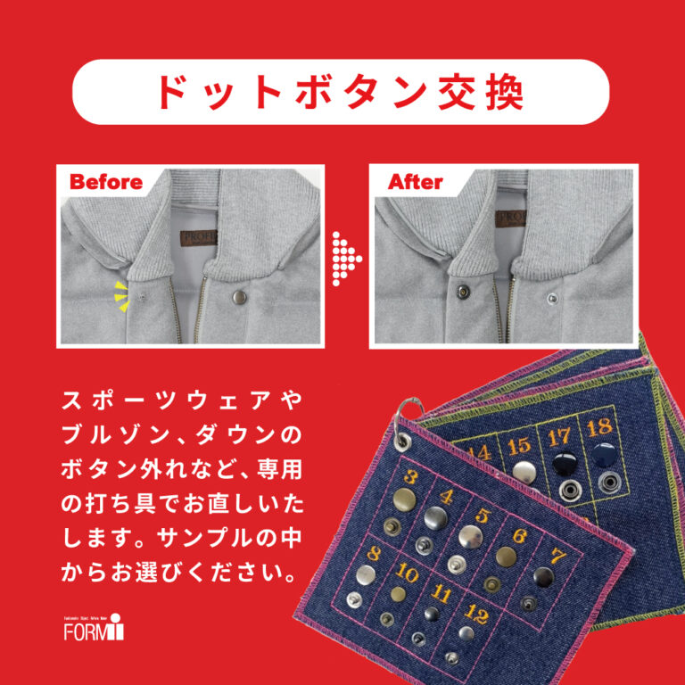 店舗ブログ 洋服のリフォームならフォルムアイ店舗ブログ一覧 店舗ブログ一覧 ◆セールで購入された「パンツの丈つめ」なら、当店にお任せください! 2026.1.2 阪急三番街店 🎍あけましておめでとうございます🎍 洋服・バッグ[...] VIEW MORE \1着1着を手作業で/ 高級ダウン&ブランド服 クリーニング✨ 2026.1.2 阪急三番街店 ご覧いただきありがとうございます。 洋服・バッグのお直し専門店【フォルムアイ】で[...] VIEW MORE 《大切なお洋服のお直しに》かけつぎ修理承ります🪡 2026.1.2 阪急三番街店 こんにちは!洋服・バッグのお直し専門店「フォルムアイ」です😊 衣[...] VIEW MORE 👖 パンツの裾上げお任せください! 2026.1.1 リンクスウメダ店(ヨドバシ梅.. 🎍あけましておめでとうございます🎍 洋服・バッグ[...] VIEW MORE 【Coat】コートのお直し🧥 2025.12.27 リンクスウメダ店(ヨドバシ梅.. ご覧いただきありがとうございます。 洋服・バッグのお直し専門店【お直しラボ】です[...] VIEW MORE 【Repair】ドットボタン/スナップボタンの交換🔨 2025.12.27 阪急三番街店 ご覧いただきありがとうございます。 洋服・バッグのお直し専門店【フォルムアイ】で[...] VIEW MORE ~大切なお洋服のお直しに~ かけつぎ修理🧵🪡 2025.12.27 高槻阪急スクエア店 こんにちは! 洋服・バッグのお直し、リメイク・オーダーサロン【アトリエ フォー [...] VIEW MORE EBBETS FIELDS×SonnyLabelスタジャン修理第二弾!【玉ぶちポケット修理】 2025.12.26 阪急メンズ東京店 いつもご利用頂きありがとうございます! 阪急メンズ東京リメイキングサロンの斎藤で[...] VIEW MORE ネット注文と何が違う?「職人と“相談できる”」本格刺繍(ししゅう)で、オリジナルの一着を✨ 2025.12.18 滋賀竜王店 ご覧いただきありがとうございます。 洋服・バッグのお直し専門店【レパレラ】です&[...] VIEW MORE 過去の記事 シルエットを細身に!シャツのお直し 2016.10.24 京阪モール店 いつもリフォームブティック京阪モール店のブログをご覧いただき、ありがとうございま[...] VIEW MORE 諦めないで!ニットのお直し 2019.11.18 アル・プラザ茨木店 こんにちは。 「リフォームブティック」アル・プラザ茨木店でございます。 秋も深ま[...] VIEW MORE [6/9-13] 超長特招会/洋服・バッグのお直し全品/HOPポイント3倍!! 2023.6.9 アル・プラザ京田辺店 いつもご利用いただきありがとうございます。 2023年6月9日(金)~6月13日[...] VIEW MORE