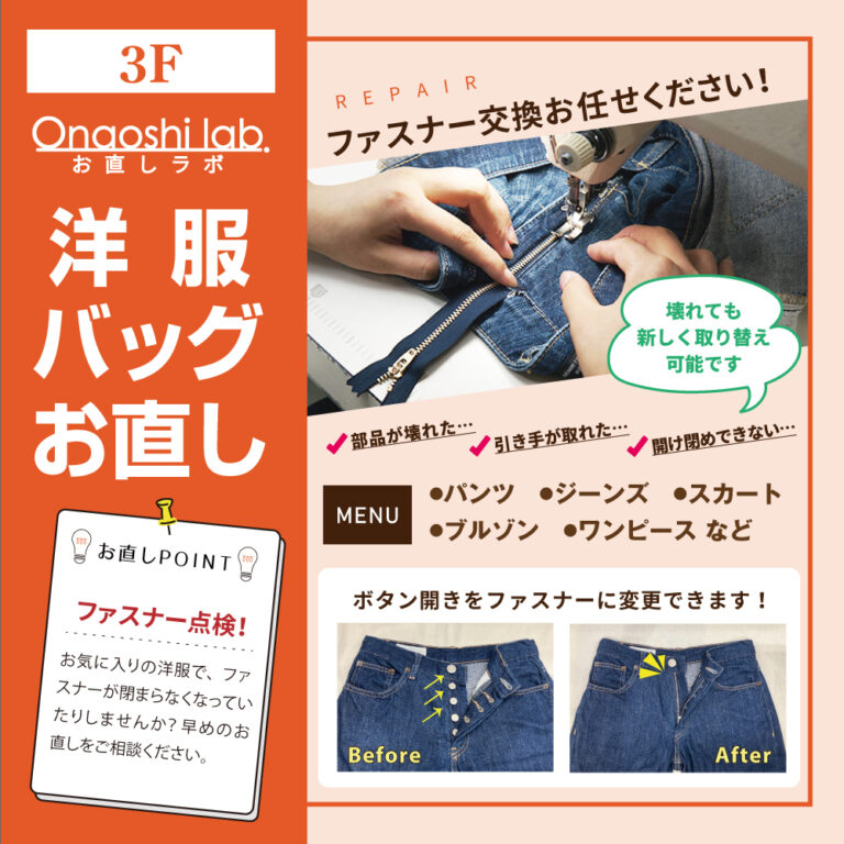 店舗ブログ 洋服のリフォームならフォルムアイ店舗ブログ一覧 店舗ブログ一覧 紳士服のお直し 2019.12.24 大丸東京店 紳士服のお直しいたします。 パンツの裾丈つめ、ジャケットやシャツの袖丈つめなどの[...] VIEW MORE 【6月のおすすめ】デニムパンツの破れ「ヒザの穴あき編」 2017.6.1 大丸東京店 当店の6月のおすすめお直しPOINT! 洋服の傷みは、早めの補修が大切です。 デ[...] VIEW MORE セールで購入した服が・・・ 2017.1.7 大丸東京店 年末年始のセールで、気になるところがあったけど ついつい衝動買いしてしまった・・[...] VIEW MORE 【12月のおすすめ】「エルボーパッチ付け」「ダッフルコートのトグル・ひも交換」 2016.12.1 大丸東京店 当店の12月のおすすめお直しPOINT! 「ジャケットやカーディガンにエルボーパ[...] VIEW MORE 【10月のおすすめ】「スカートのウエストをリブに」「表シック付け」 2016.10.1 大丸東京店 当店の10月のおすすめお直しPOINT! アイテム別にお直しポイントをご紹介しま[...] VIEW MORE 【9月のおすすめ】「ジャケットのつき取り」「ベルトを短く」 2016.8.31 大丸東京店 当店の9月のおすすめお直しPOINT! アイテム別にお直しポイントをご紹介します[...] VIEW MORE 8月のおすすめお直しPoint! 2016.8.1 大丸東京店 当店の8月のおすすめお直しPOINT! アイテム別にお直しポイントをご紹介します[...] VIEW MORE 7月のおすすめお直しPoint! 2016.6.30 大丸東京店 当店の7月のおすすめお直しPOINT! アイテム別にお直しポイントをご紹介します[...] VIEW MORE 6月のおすすめお直しPoint! 2016.5.31 大丸東京店 当店の6月のおすすめお直しPOINT! アイテム別にお直しポイントをご紹介します[...] VIEW MORE 過去の記事 【Repair】ファスナー修理お任せください🧵 2025.11.21 リンクスウメダ店(ヨドバシ梅.. ご覧いただきありがとうございます。 洋服・バッグのお直し専門店【お直しラボ】です[...] VIEW MORE \おすすめ/ スカート・ワンピース👗着丈つめ 2025.7.2 阪急三番街店 ご覧いただきありがとうございます。 洋服・バッグのお直し専門店【フォルムアイ】で[...] VIEW MORE 北大路ビブレ店20日30日お客さま感謝デー 2017.7.14 イオンモール北大路店 京都の地下鉄烏丸線北大路駅真上の北大路ビブレ2Fで営業しております、 「リフォー[...] VIEW MORE