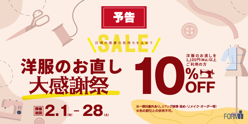 2026年2月1日(日)~2月28日(土)の期間中、洋服のお直しを1,100円(税込)以上ご利用の方は10%OFFにて承ります。