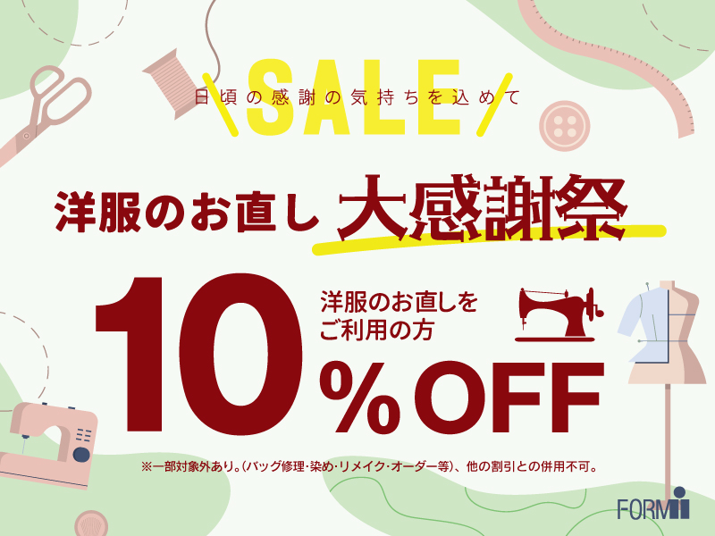 2026年2月13日(金)~2月22日(日)の期間中、洋服のお直しをご利用の方は10%OFFにて承ります。