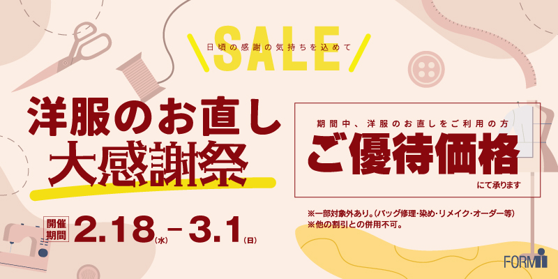 [2/18-3/1] お直し料金が特別価格に!洋服のお直し大感謝祭🎉開催!