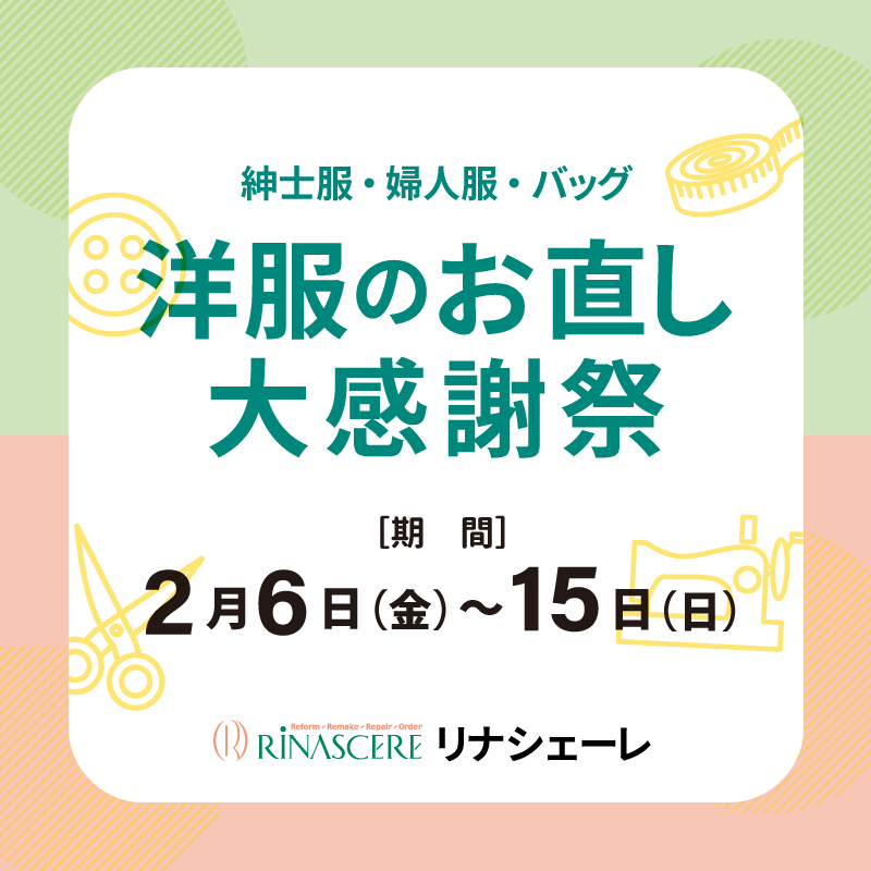 2026年2月6日(金)~2月15日(日)の期間中、洋服のお直しをご利用の方は10%OFFにて承ります。