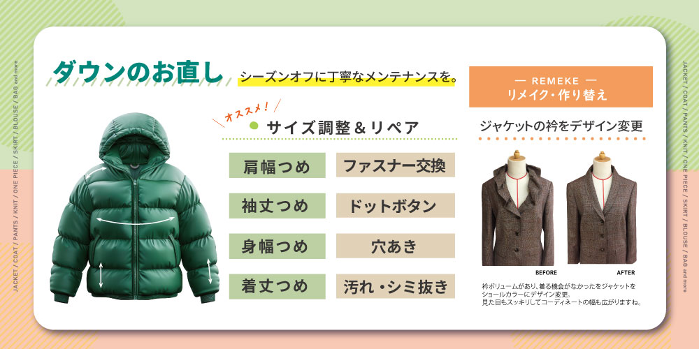 セールやネットで購入されたお洋服で、”あともう少し”気になる箇所がございましたらこのお得な機会にぜひご利用ください。