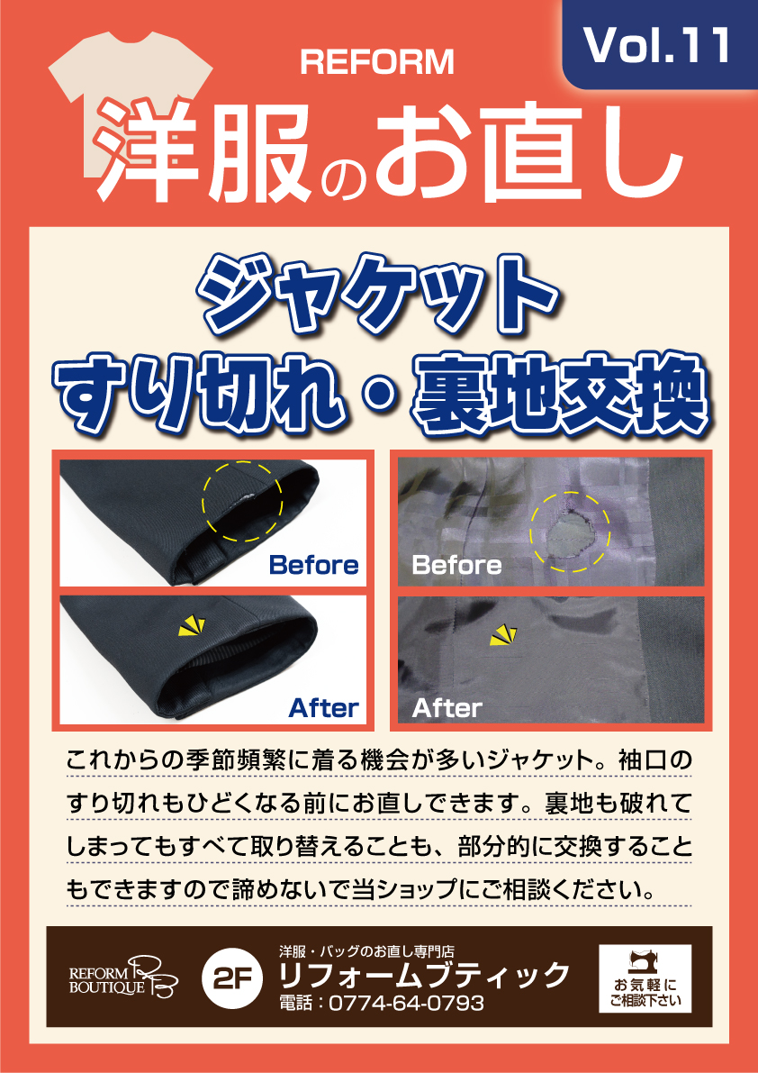 見えないから大丈夫!と思っている裏地の破れも、放置しているとお洋服本体の破れにつながります。早めのお直しで、きちんと修繕しませんか?全体交換ではなく、部分交換なども承りますので、お気軽にスタッフまでご相談ください。