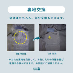 加工難易度により納期が大きく変わりますので、お直しする商品をご持参いただき、店舗スタッフまでご相談ください。
