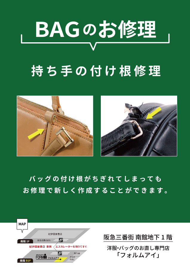 阪急三番街でお買い上げの商品はもちろん、他店でお買い上げされたお手持ちのバッグもお直しを承ります。