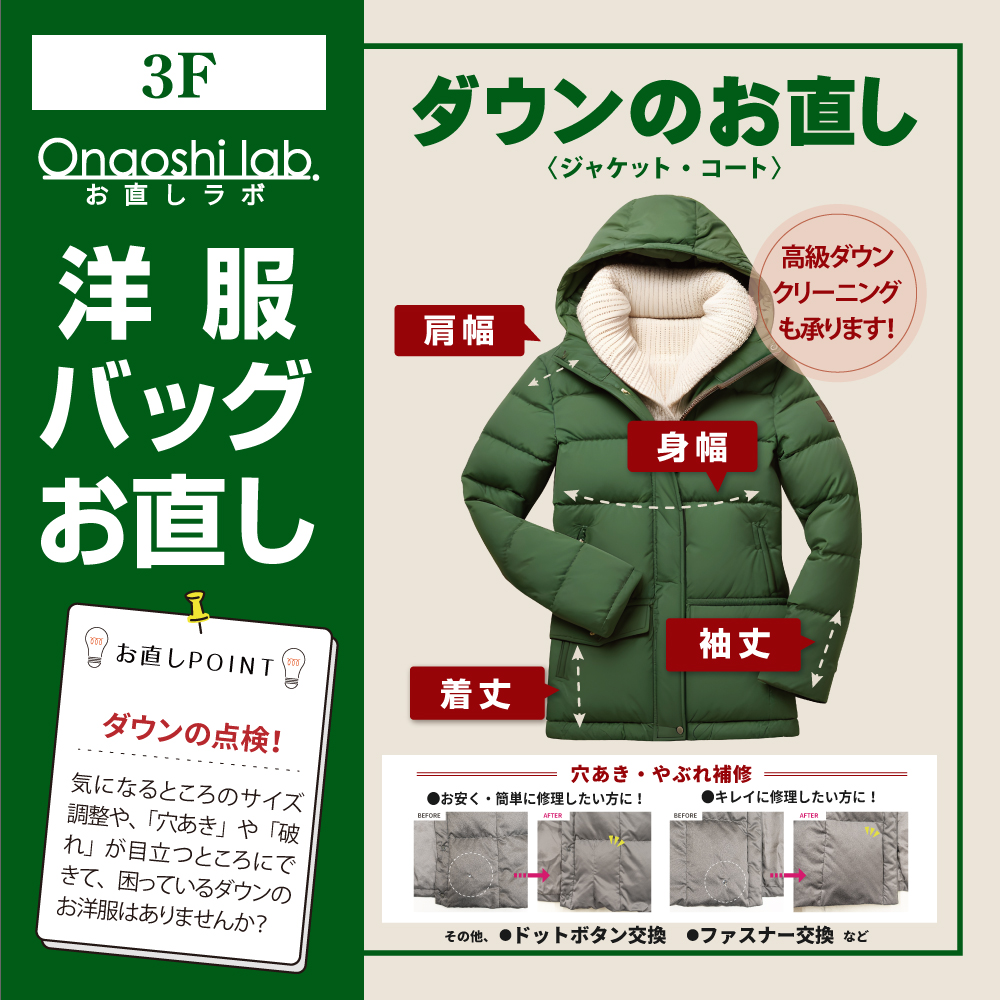 ※ダウン製品のお直しには、日数を頂戴しております。お直しには、余裕を持ってお持ち込みください。