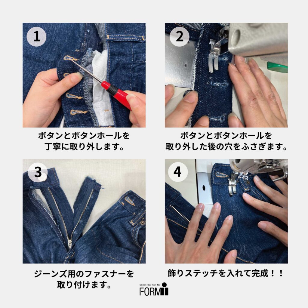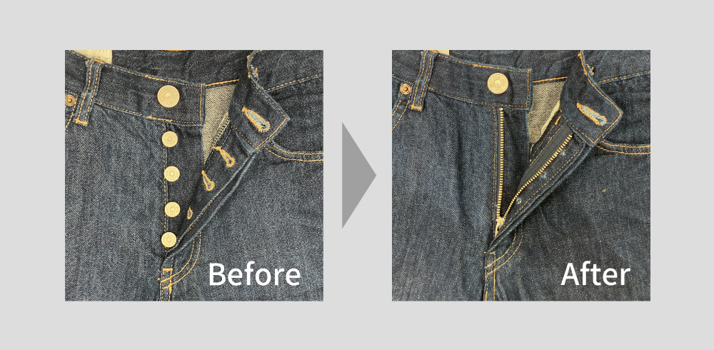 ジーンズの前ボタン(ボタンフライ)をファスナーに変更することができます。